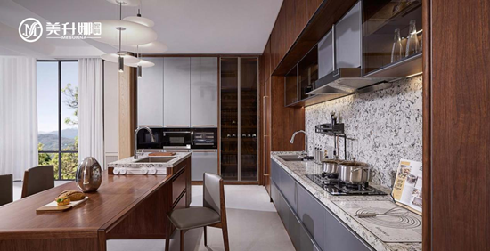 在家的所有空間中,廚房是最能體現(xiàn)生活溫度的地方。這里既有柴米油鹽的瑣碎,也有親友相聚的熱鬧;既有油煙的喧囂,也有木質(zhì)的沉靜。美升娜家具以北美黑胡桃木為材,在廚房空間里編織實用與美學的雙重奏,讓蒸騰的煙火氣與溫潤的木之韻在此共生共舞,將日常烹煮化作一場具象的生活藝術(shù)。