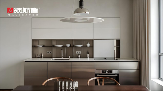 北歐風(fēng)的“極簡(jiǎn)”藏在領(lǐng)航者廚房定制柜的功能里,廚房一體化柜體外側(cè)平整,內(nèi)里卻藏“收納魔法”——封閉柜可存放換季或不常用的廚房雜物,讓空間遠(yuǎn)離雜亂;開放格用來放置常用餐具,拿取格外順手;高柜的設(shè)計(jì)則方便取用深處物品,每一處空間都能被高效利用,真正做到功能“藏而不露”,令廚房既有著簡(jiǎn)約大氣的視覺效果,又能充分滿足實(shí)用的收納與操作需求。